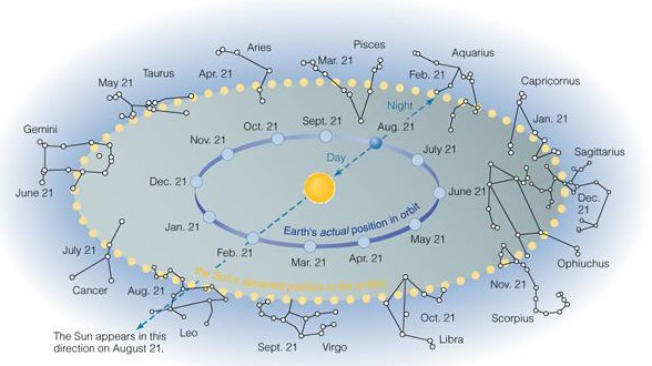 Now, pretend you’re looking up at the Sun from Earth’s surface. Depending on the date, the Sun will have a different backdrop of stars. Take a look at Image XX. Note the position of the Earth (the small blue disk) in relation to the Sun on August 21. During the daytime, if you could see the stars behind the Sun, you would see the constellation Leo. As time passes and the Earth progresses around the Sun, the background of stars behind the Sun will continue to change, progressing around the constellations of the zodiac. On September 21, you would see the constellation Virgo. On October 21, you would see the constellation Libra, and so on.